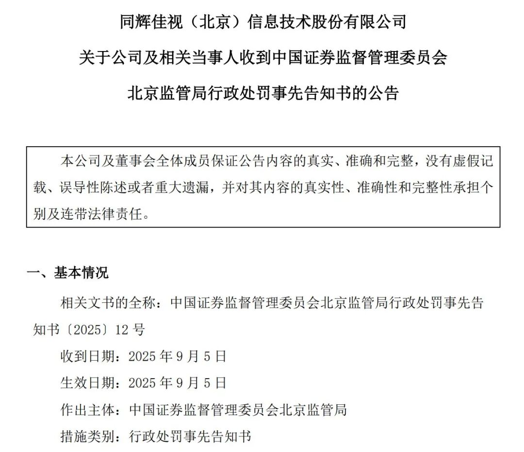 近日,同辉信息(430090,BJ)公告称,收到中国证券监督管理委员会北京监管局下发的《行政处罚事先告知书》(〔2025〕12号)。